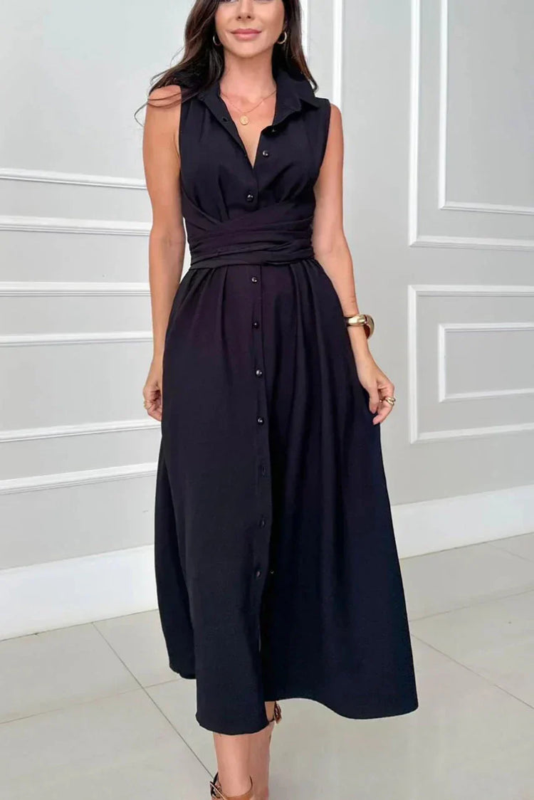 Son col chemise élégant et son boutonnage discret dessinent une ligne épurée, tandis que sa taille drapée vient naturellement affiner la silhouette. Chaque détail a été soigneusement étudié pour vous offrir une robe aussi confortable que flatteuse, idéale pour celles qui recherchent une allure soignée sans effort.